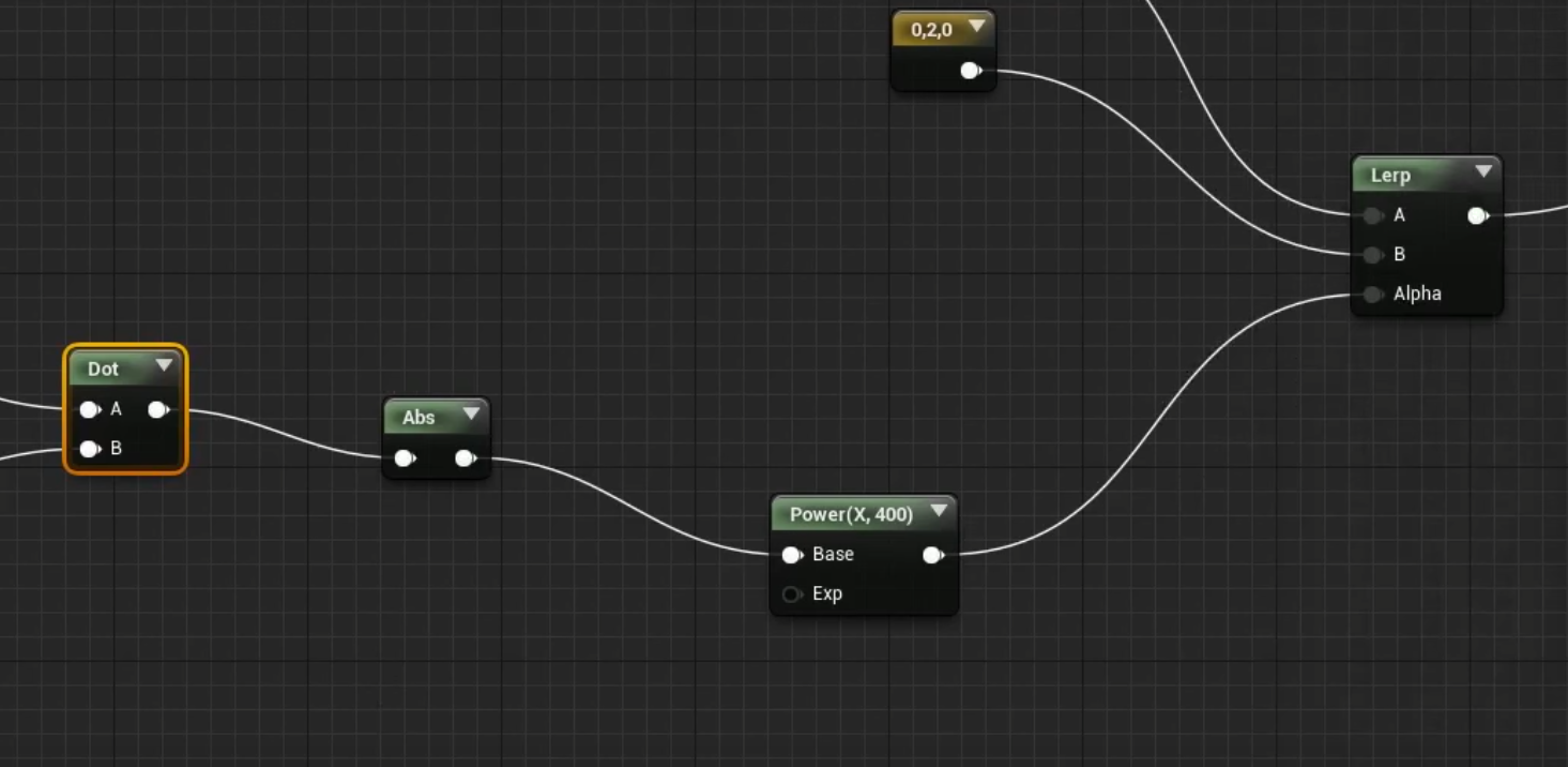 언리얼 엔진의 DOT 노드는 벡터의 내적을 말합니다. Dot을 치면 바로 나옵니다.